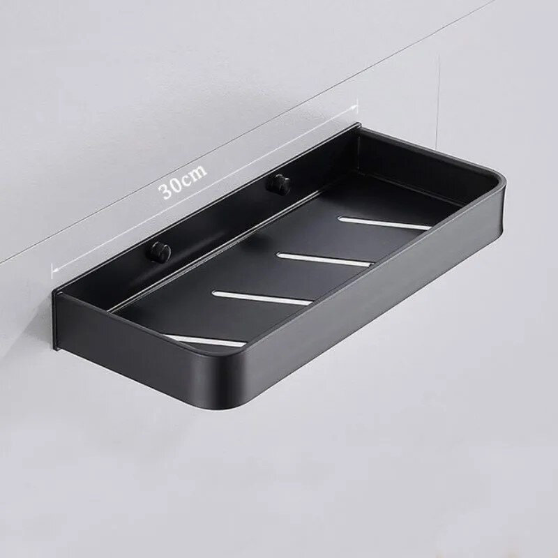 Настінна поличка для ванної кімнати з алюмінію – практичне та довговічне рішення для зберігання. Не піддається корозії, не боїться вологи та легко вписується в сучасні інтер’єри завдяки стриманому лаконічному дизайну. Поверхня має захисне покриття – міцний ґрунт і матове чорне фарбування.