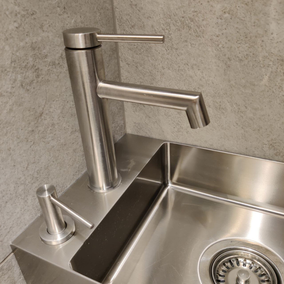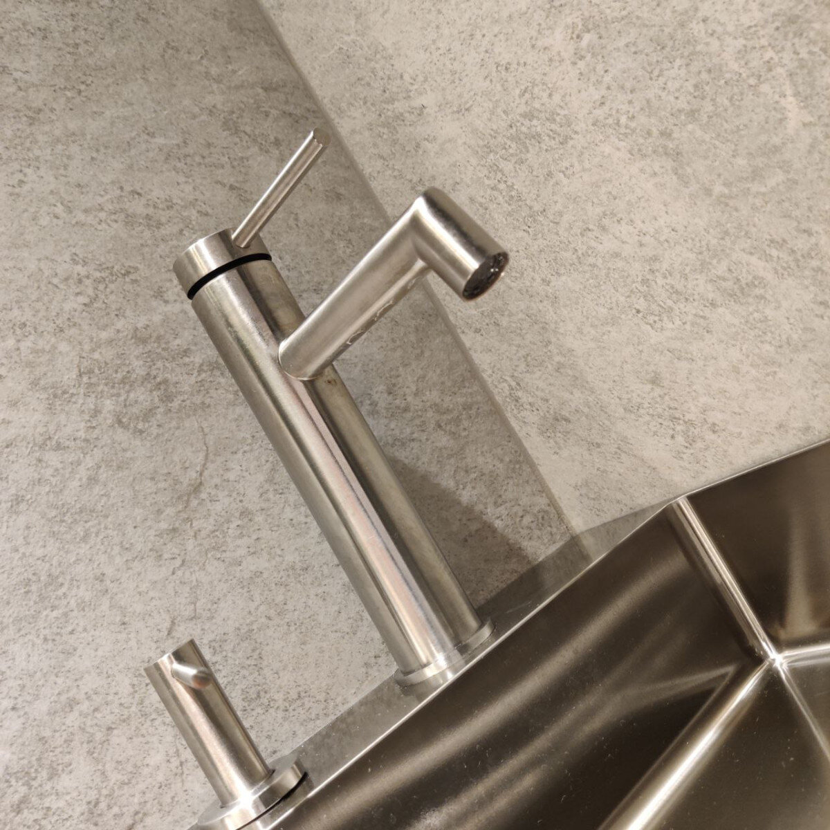 Цей змішувач виготовлений повністю з нержавіючої сталі SUS 304 — від корпуса до ручок та виливу. Сталь цієї марки відзначається високою стійкістю до корозії та побутової хімії, на відміну від дешевших варіантів із 201-ї сталі. Жодних напилень і декоративних покриттів — лише справжній метал, який не стирається і не облазить.