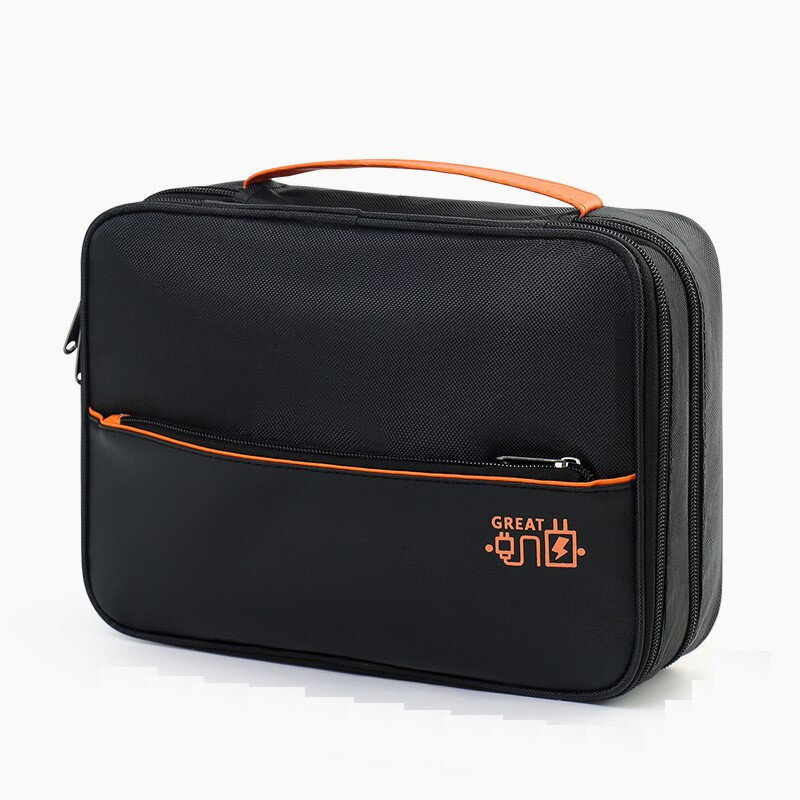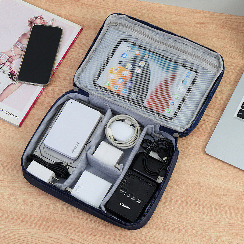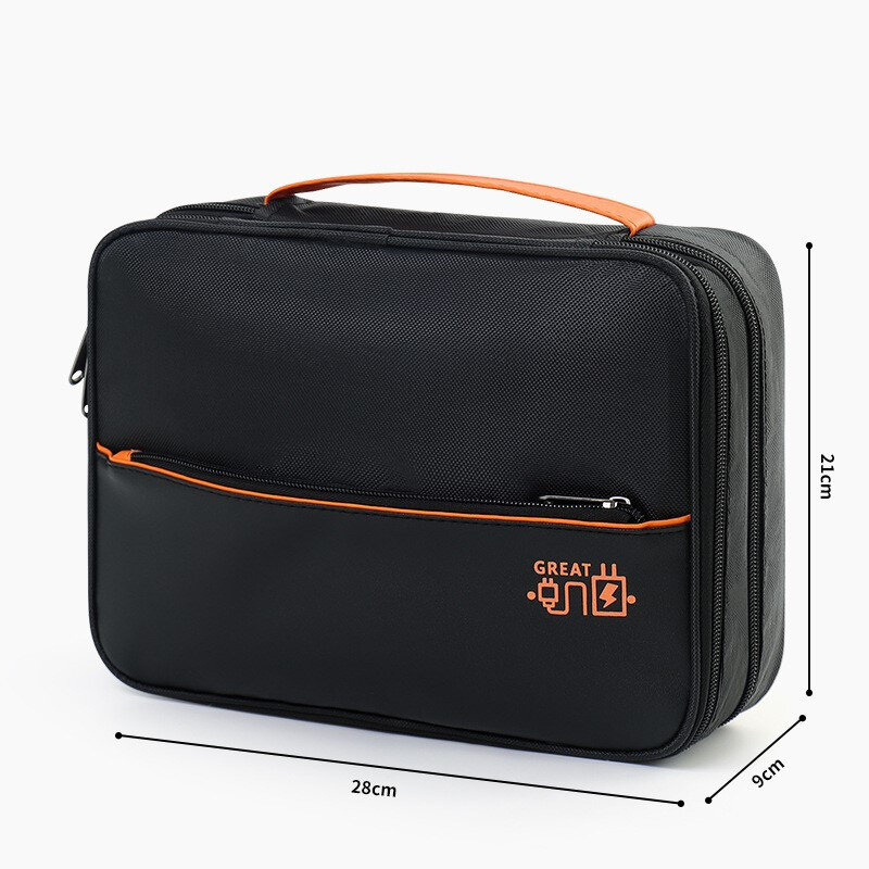 Компактна сумка-органайзер для зарядних пристроїв, кабелів та дрібної електроніки. Має два відділення на блискавці: верхній — з кишенями й резинками для дрібниць, нижній — з глибокими секціями та сітчастою кишенею.