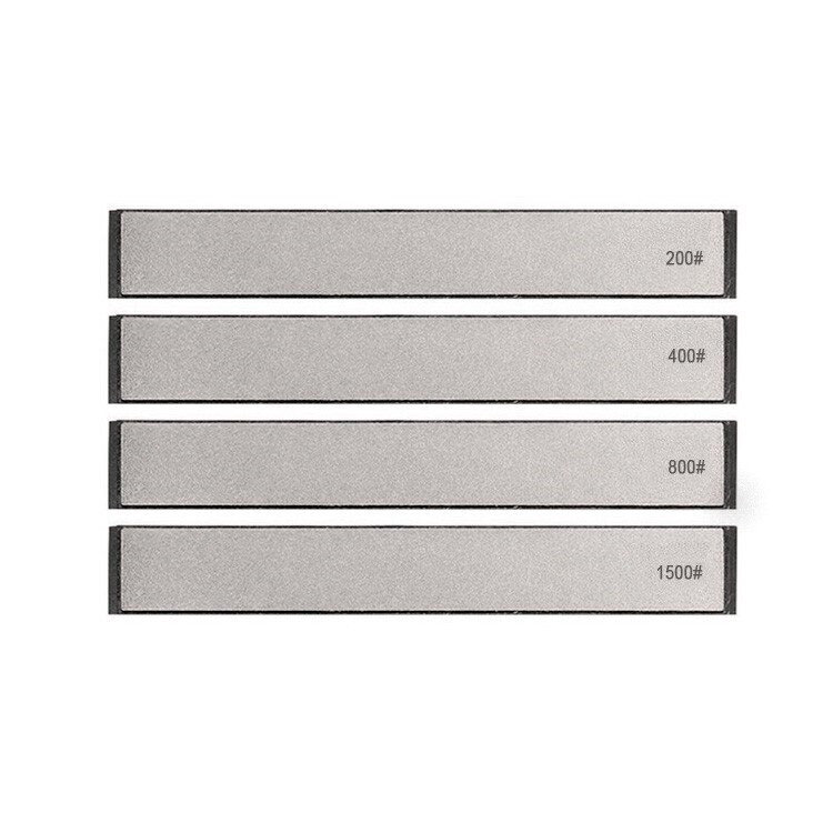 Набір алмазних каменів для заточування ножів та інструментів. Складається з 4 брусків різної зернистості (200, 400, 800, 1500 Grit), які підходять для грубого та фінішного шліфування. Алмазне покриття нанесено на сталеву основу, що забезпечує рівномірну обробку та довгий термін служби. Камені фіксуються на пластиковій основі. Розмір кожного — 161×23 мм.