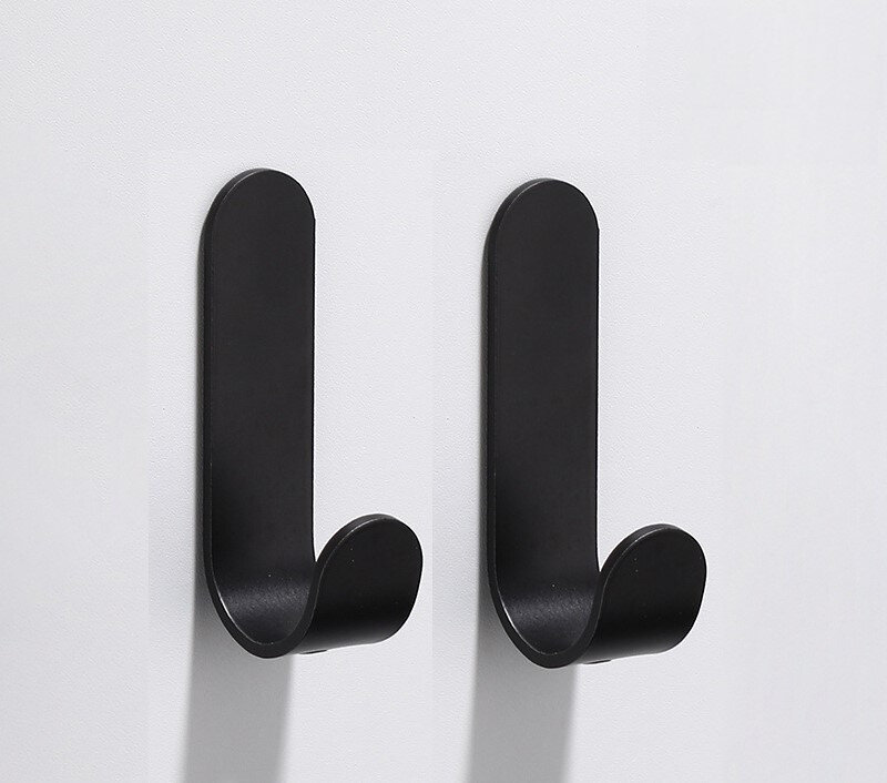 Комплект з 2 настінних гачків з алюмінію – стійкі до вологи та навантажень до 5 кг. Розміри: 7,5 × 1,8 × 3,5 см. Кріплення здійснюється за допомогою силіконового клею (входить до набору).
